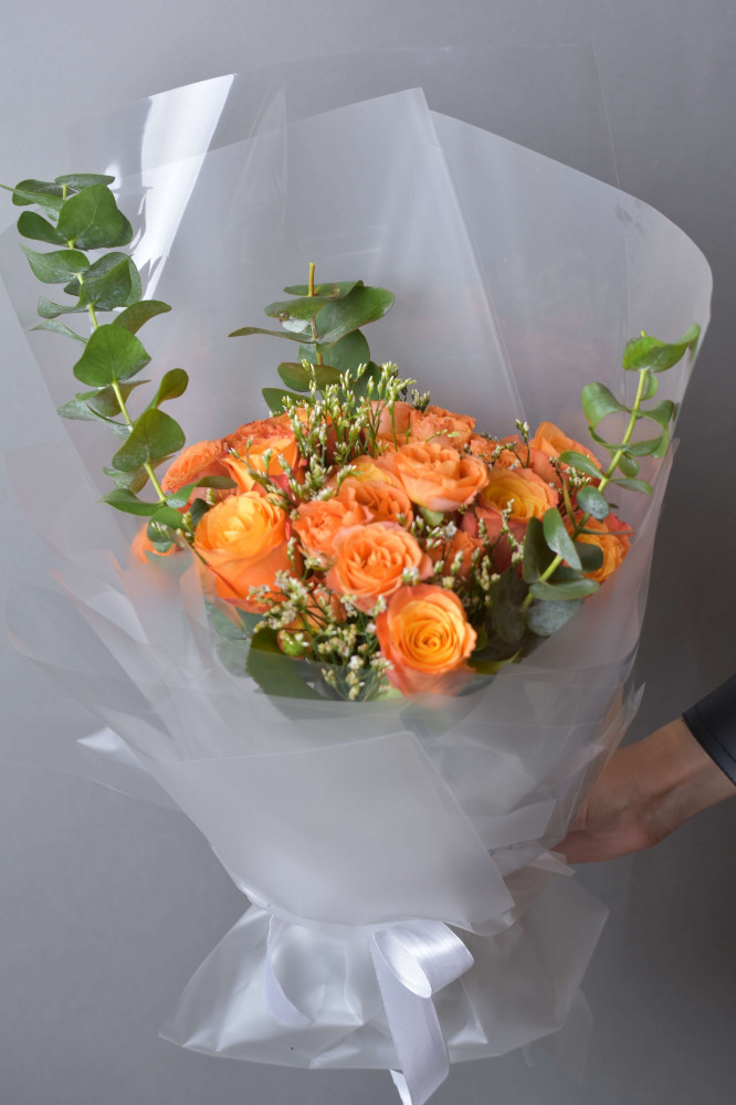 باقة مكونه من الزهور الطبيعية تحتوي على الروز والبيبي روز الأورنج وخضار القرز الفواح وزهرة اللامينيوم الرائعة ,مغلفه بتغليف شفاف (ثلجي) رائع يعكس دفء الباقه معقوده بشريطه بيضاء ..
