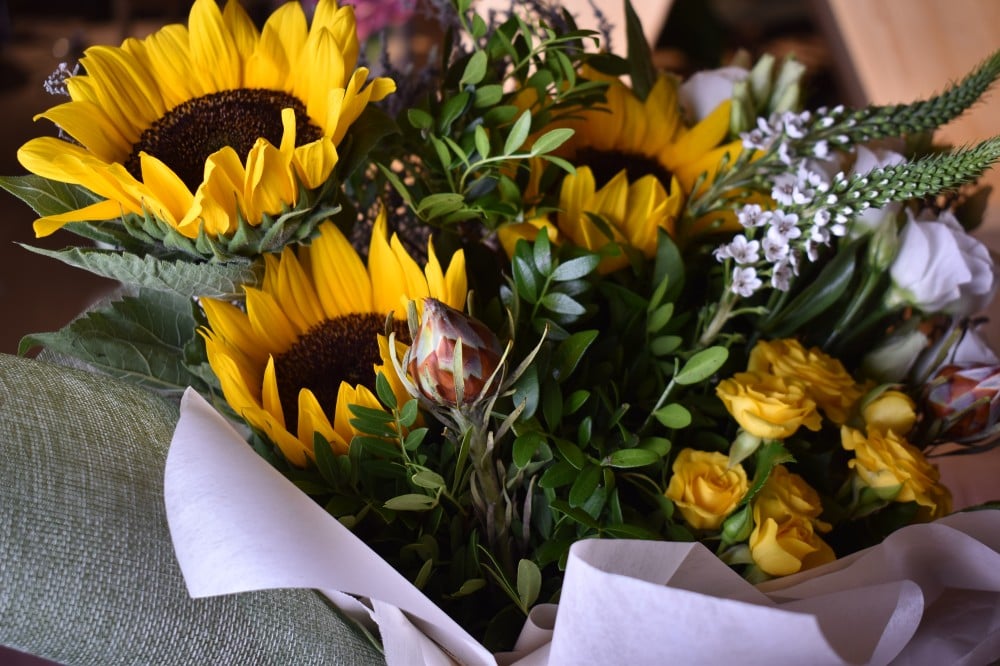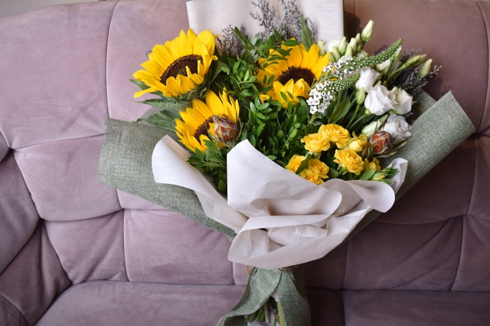 بوكيه ورد دوار الشمس 2 المكون من استوما ودوار الشمس وبيبي روز وايضا اكسسوارات طبيعية مع تغليف مميز وشريطة خيش مميز .