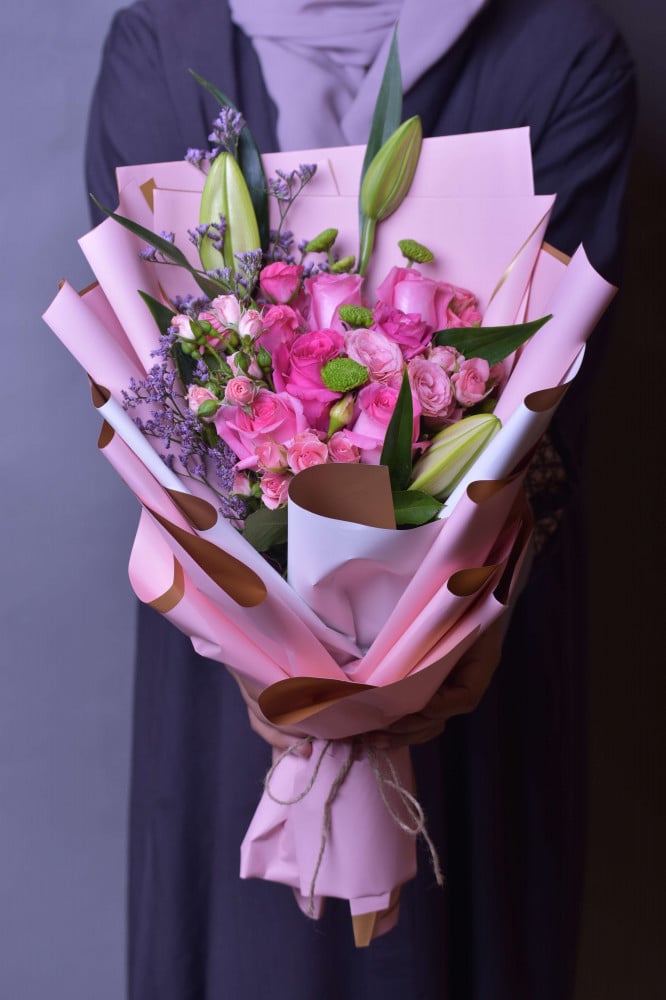 باقة مكونه من الزهور الطبيعية تحتوي على الروز والبيبي روز الوردي مع مجموعة من أغصان الليليوم واليمونيم المميزة مفلفة بتغليف وردي مميز و معقودة بشريط جذاب.