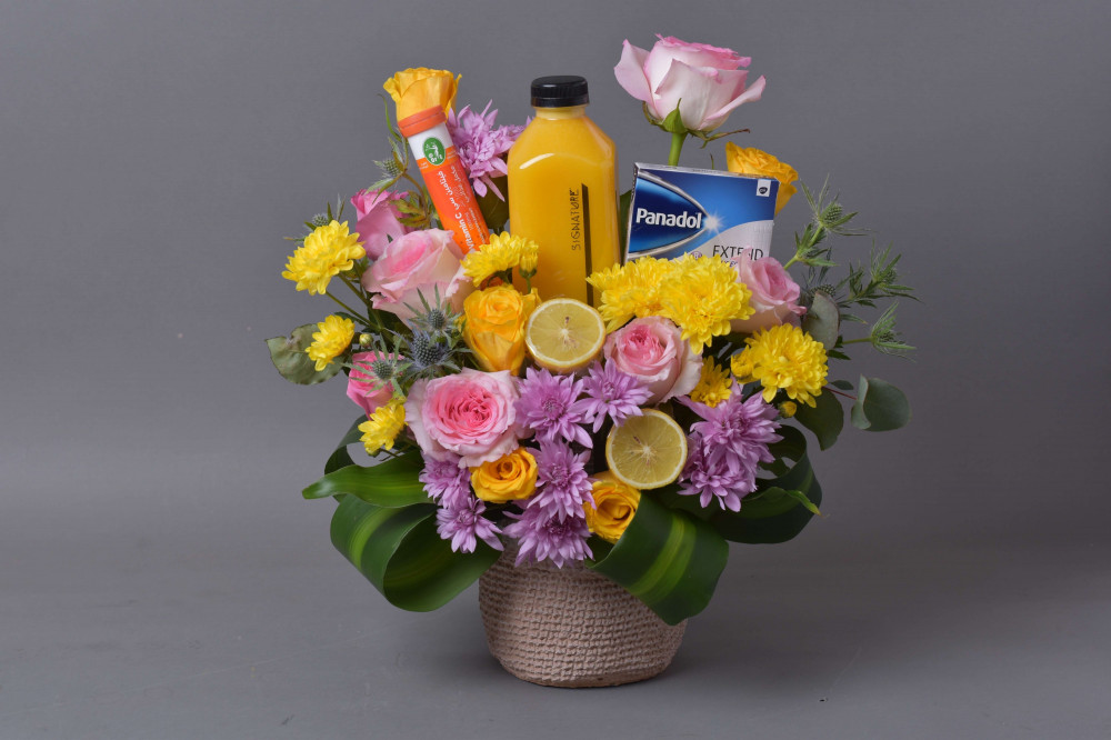 الفازة الشفاء هدية عصير مع ورد تحتوي على الزهور الطبيعية الروز والكريز والقرز الفواح وخضار الماسينجا المميز مع :